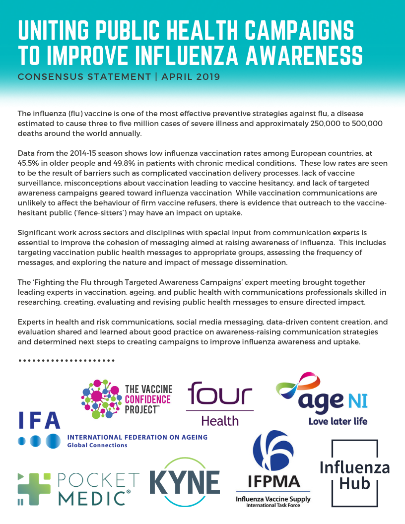 The following consensus statement was formed as a result of the “Fighting the Flu through Targeted Awareness Campaigns” expert meeting convened by the IFA in January 2019 which brought together leading experts in vaccination, ageing, and public health with communications professionals skilled in researching, creating, evaluating and revising public health messages to ensure directed impact.