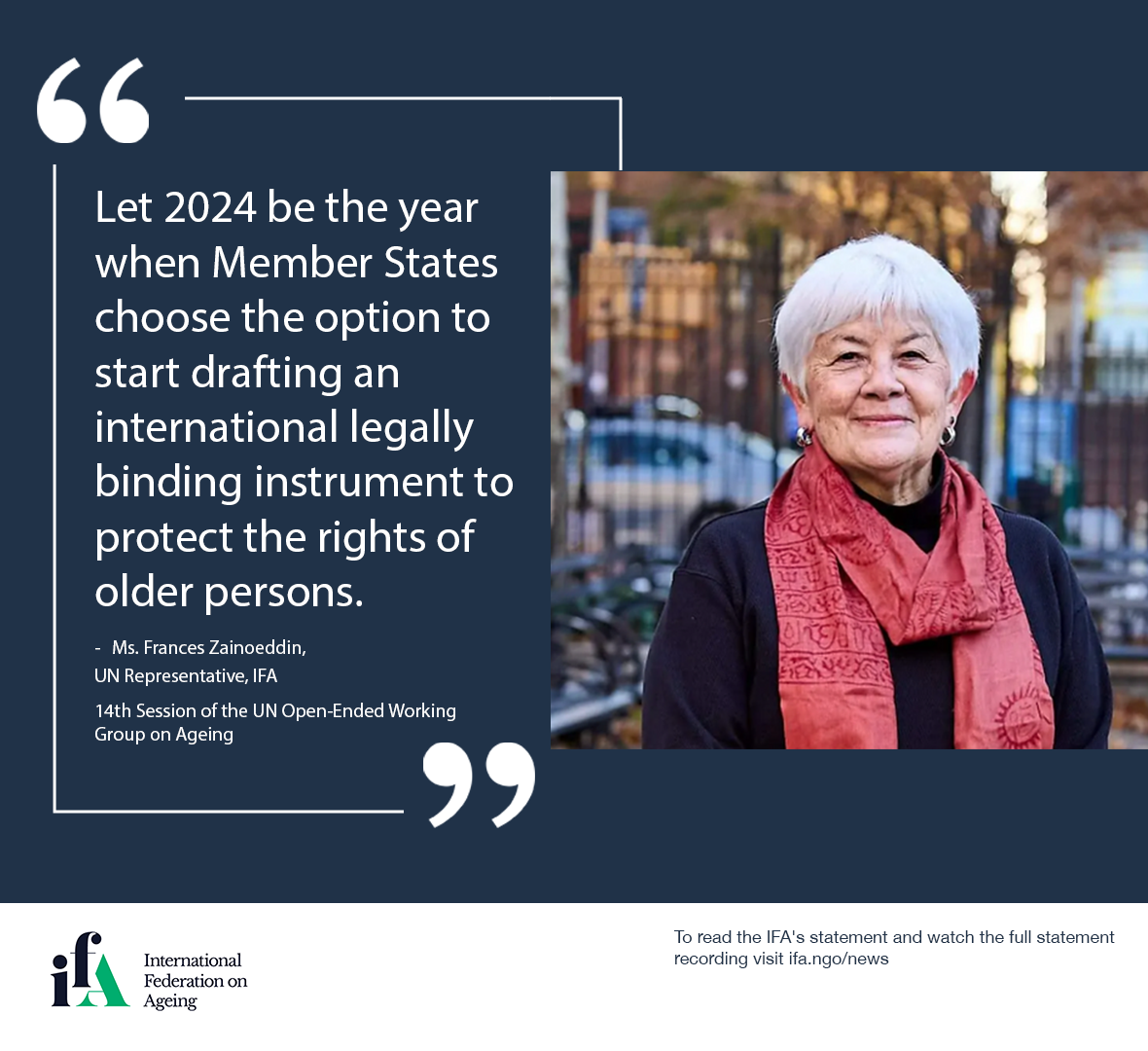 UN Representative Frances Zainoeddin delivered IFA’s statement at the 14th Session of the United Nations Open-Ended Working Group on Ageing (OEWGA) on 20 May 2024. Addressing UN Member States, Ms. Zainoeddin identified that after thirteen years of discussion over 900 documents have been submitted to the Working Group demonstrating that there are gaps in the international framework of the human rights of older persons. The IFA calls upon Member States to respond to these gaps with an international legally binding instrument to protect the human rights of older persons.
