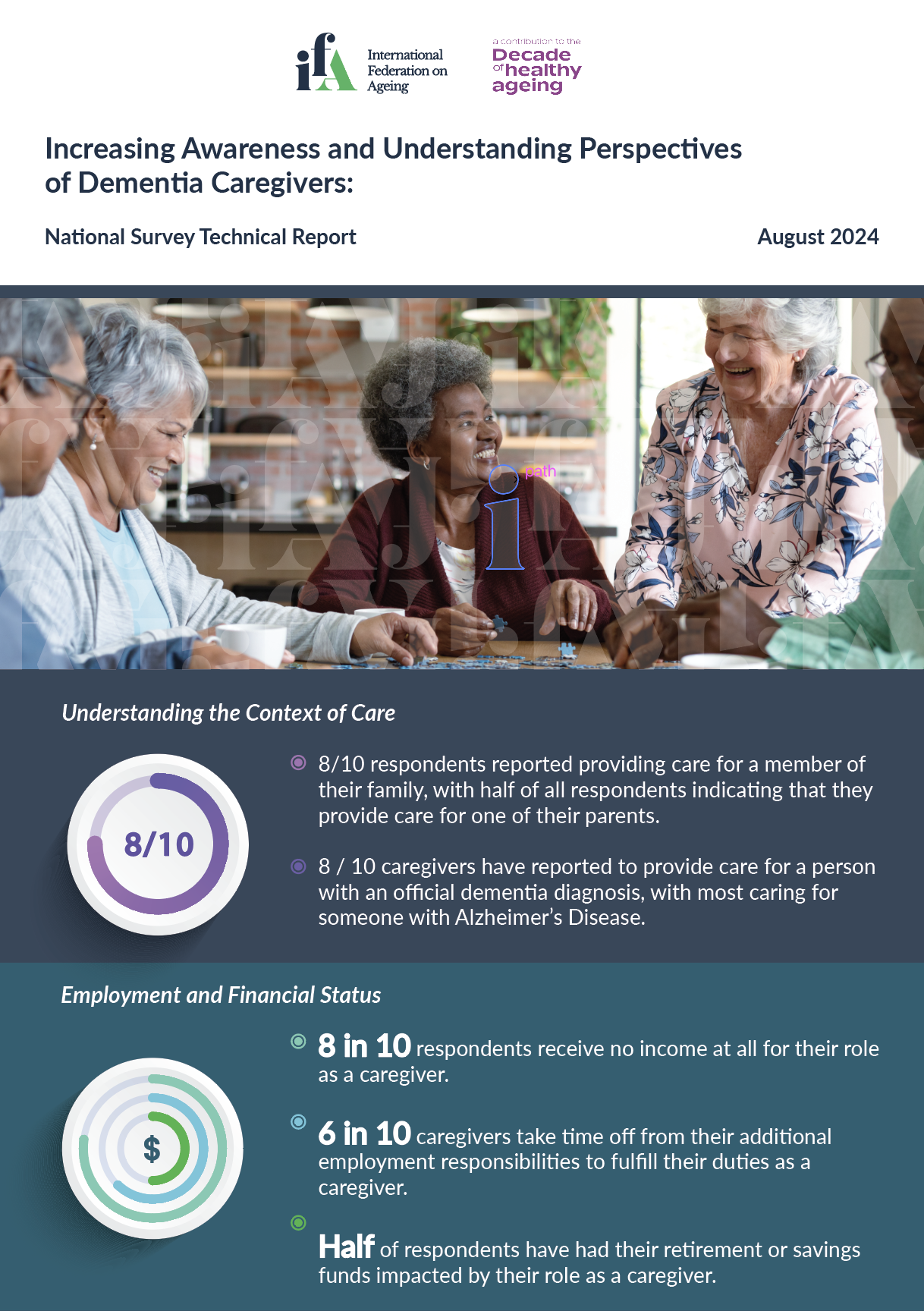 The key objective of this study is to improve social awareness and knowledge of the experience of providing care for a person with dementia. The study includes a national survey designed and disseminated by the IFA. The survey was completed by 397 respondents identifying as caregivers for a person with dementia.